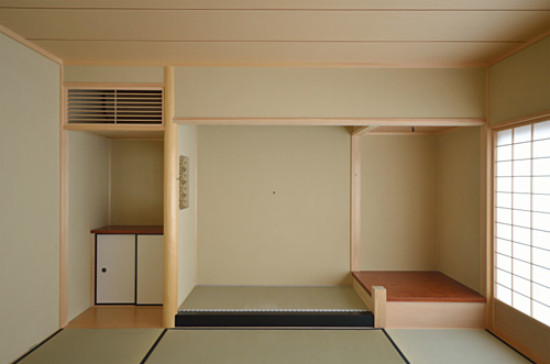 床の間奥壁を開閉式にして、床の間裏収納を設ける