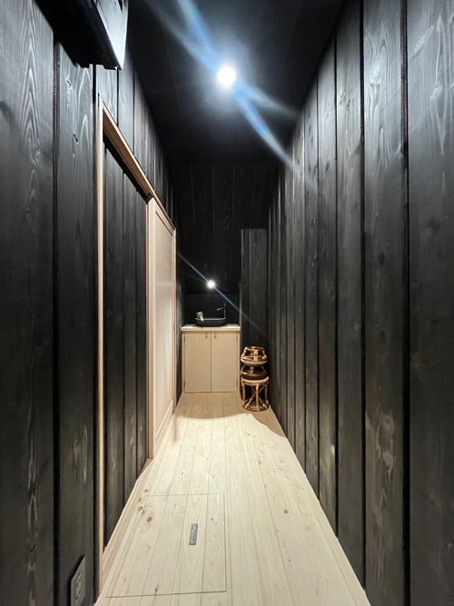 八畳広間脇に室内露地廊下を設けました。奥がトイレになります。八畳間からは木戸で出入りします。露地廊下に蹲に代わり手水を設置し、ここが茶事で中立の時の待合となります。