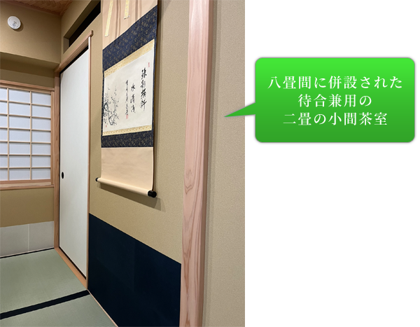 場面に応じて、小間と四畳半に間取りを自由に変えられる茶室です。