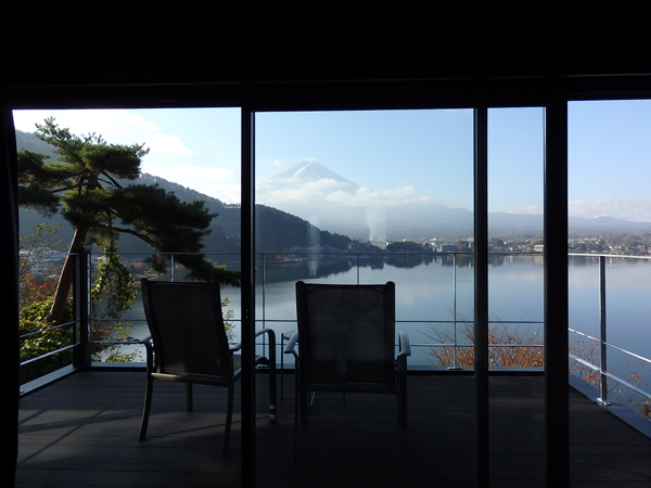 | デッキから見える風景は 自然豊かな河口湖と富士山。 四季の姿を楽しむことができる。 |