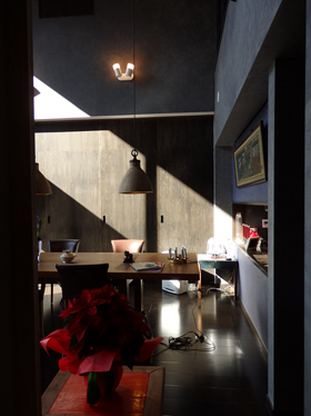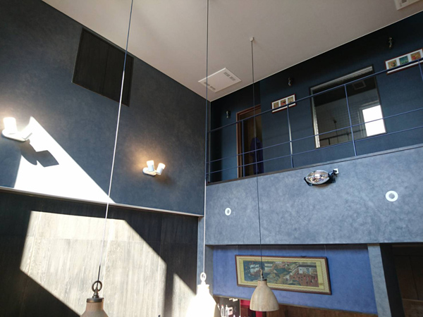 | 【よいうたげ】の上部の吹き抜けの様子。 ダイニングテーブル位置にペンダントライトが三灯取り付けられてる。 天井の高い吹き抜け空間で、光量が不足しないように、 壁面にスポットライトが取り付けられている。 |