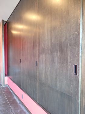 リビングとダイニングを仕切る吊り戸。 全て開放したいときは戸袋に収納できる。 |