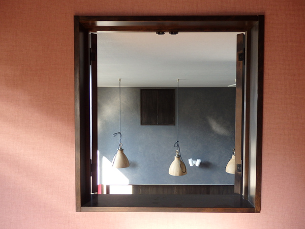 | 建具はナチュラル色の木目仕様。 | 吹き抜けを見下ろせる窓と、 電球色の照明が設置されている。 |