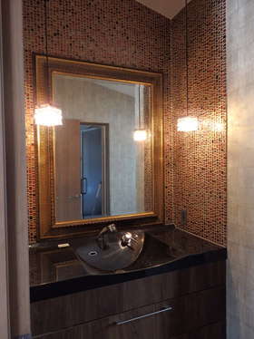 | 床は石貼りで仕上げ、キッチンの両サイドおよび正面は 美しい模様を施した国産のタイルを使用している。 シックな色合いのキッチンに合わせた落ち着いた空間になっている。 |