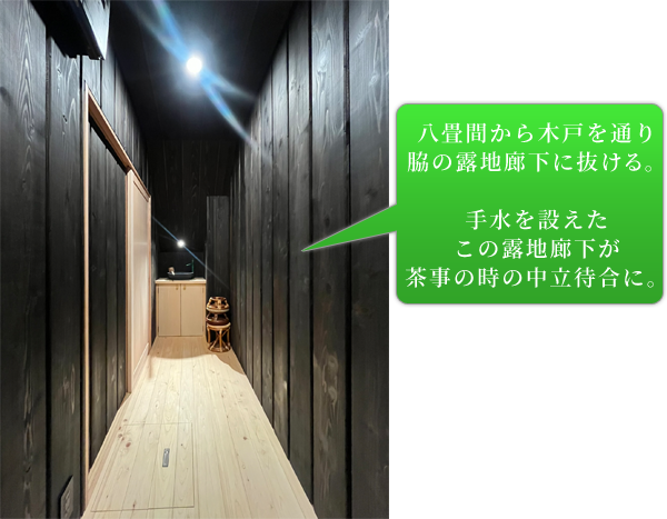 八畳広間脇に室内露地廊下を設けました。奥がトイレになります。八畳間からは木戸で出入りします。露地廊下に蹲に代わり手水を設置し、ここが茶事で中立の時の待合となります。