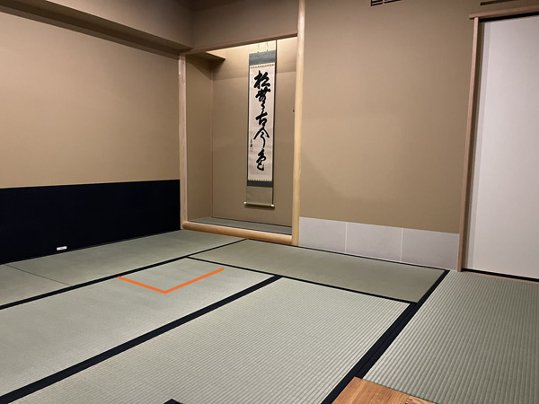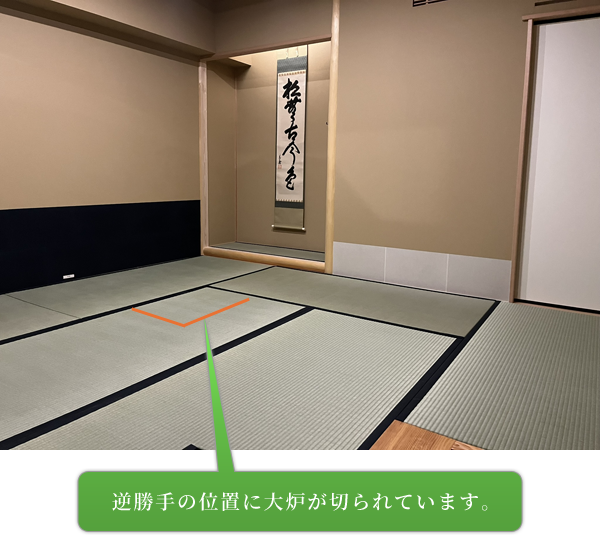 八畳茶室となるところは、スペースの都合で京間寸法の茶室は造れません。そのための工夫として、お客様のご要望で台子などの上級点前稽古にも対応できるよう点前座の畳幅を広げ(中京間寸法)、その他の畳の寸法を調整しながら畳八畳の全体バランスを取りました。また、逆勝手に大炉も切り、大炉点前にも対応できる茶室となりました。