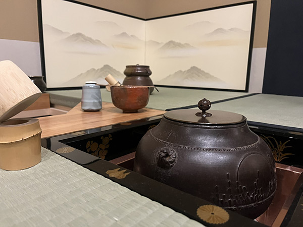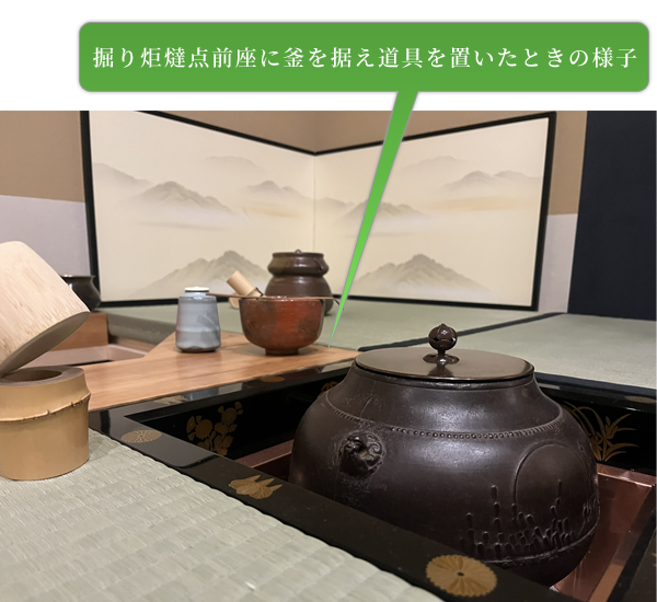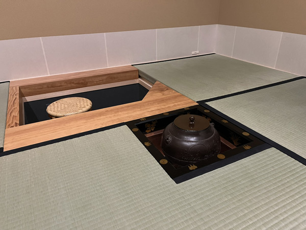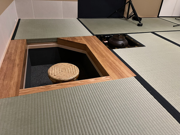 普段の生活の中では、正座をする機会はほとんどありません。茶道から遠ざかる大きな理由のひとつが、稽古を続けたいけど、正座が難しくなってきた、というものです。正座文化の無い外国の方にも、お茶を点てる場”を提供したい。そんなお客様の思いを実現しました。この点前座掘り炬燵のもう一つの特徴が、「炉の点前」に対応している点です。