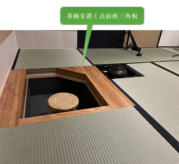 点前で身の構えが炉に向くときに、茶碗、茶筅、棗など道具が置かれる位置が、掘り炬燵がある場合と無い場合とで、変わらないようにしなければなりません。掘り炬燵炉側の角に「三角板」を設け、炉の時の身の置き様と正座の時と変わらない点前が出来るよう「点前座掘炬燵」として設えました。