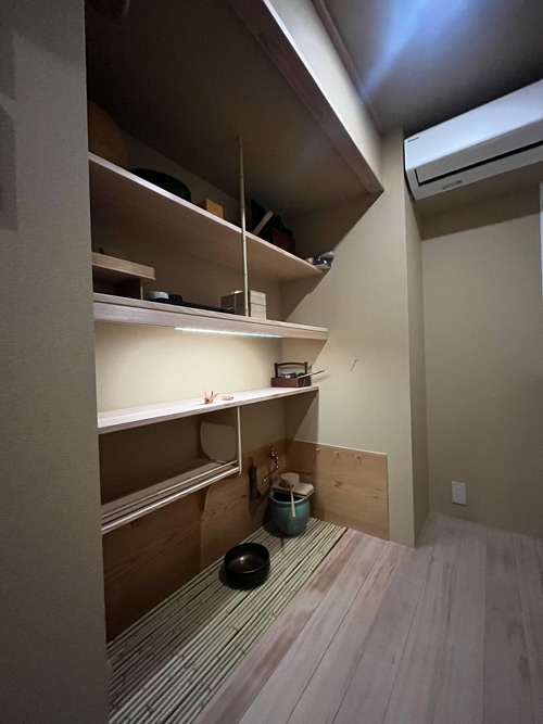 階段下の為、水屋高さには制限があります。なので、天袋をつけることが出来ません。水屋には、表千家水屋の特徴である灰器を置く吊り棚が必要。今回はその吊り棚の脇に、照明を仕込んだ一枚棚を設け、オープン棚付き水屋としました。通い盆名などの収納に便利です。そして普段は廊下エリアなので、ロールカーテンで隠すようにしてます。