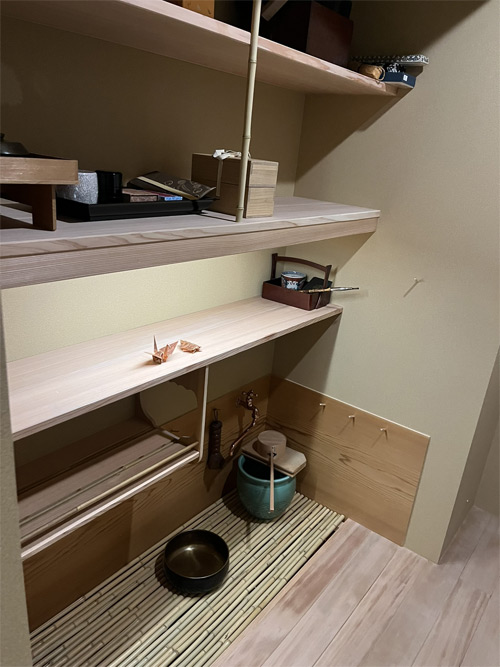 (例)水屋棚脇にオープン棚を儲け、影で茶を点てられるスペースをつくる