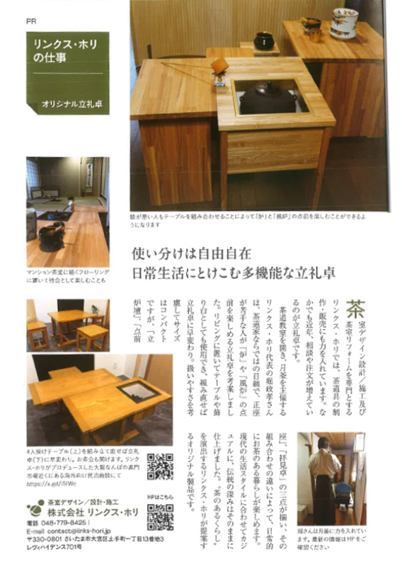 茶道雑誌「なごみ」(出版:淡交社)に、リンクス・ホリの立礼卓広告が掲載されております。こちらの画像よりご覧いただけます。